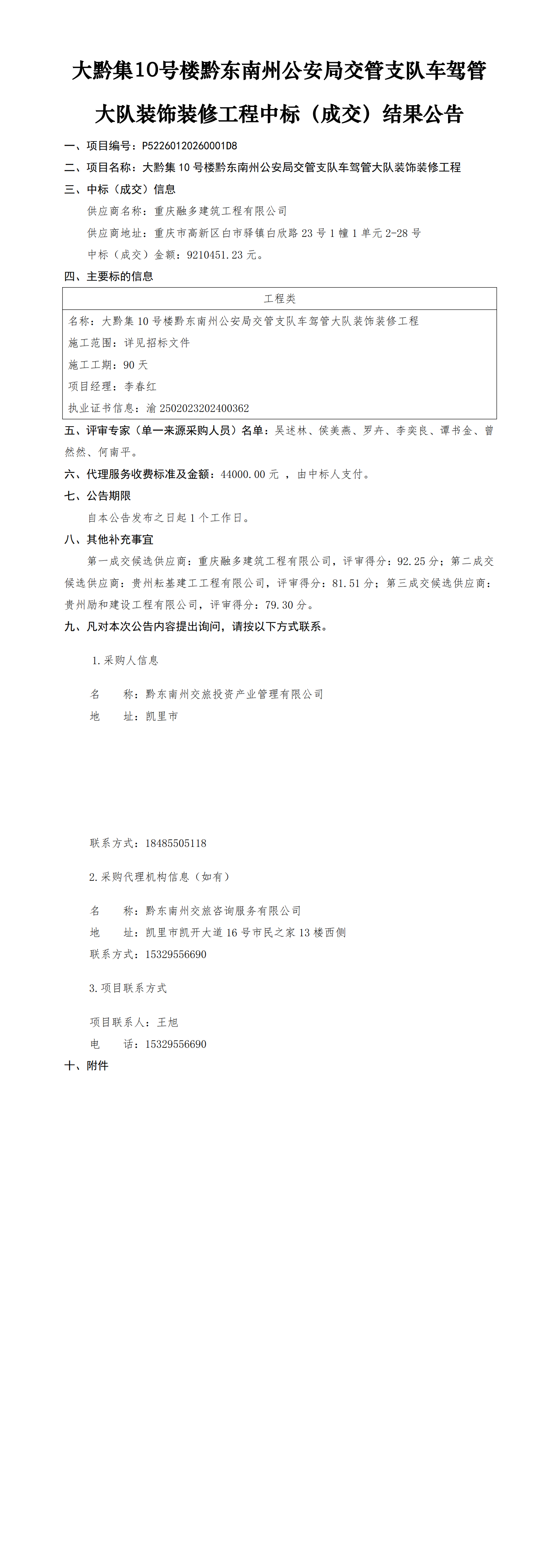 大黔集10号楼黔东南州公安局交管支队车驾管大队装饰装修工程中标(成交)结果公告